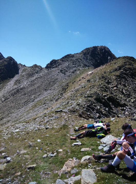 Desde Ferreroles bajábamos hacia Sorteny, lugar en que se encontraba el primer puesto de avituallamiento. A poco más de 21 kilómetros de la salida, caras largas en el avituallamiento, gente sentada a la sombra con la cabeza entre las piernas… Menudo panorama. Me lo tomo con calma. Mucha fruta (melón y sandía sobre todo) y reorganizo un poco la mochila. Llevo bastante peso y con el esfuerzo extra de los bastones se me están empezando a cargar las cervicales. El calor empieza a hacer acto de presencia. Cargo agua a tope, tomo sales y salgo con calma para recorrer los 11 km que me separan del próximo avituallamiento en Arcalís. Todo toboganes, el recorrido parece rebuscado para exigir el 120% de esfuerzo y no dar tregua a las piernas. Pasando la Portella de Rialp, primer tramo con nieve, nos encontramos en la cima a un rebaño de cabras que nos miran con cara de “vosotros estáis imbéciles” (y no les quito la razón). En esta primera parte la carrera ya va muy estirada. Apenas hay movimiento de gente que adelantes o te adelante salvo en las cimas o en los avituallamientos, donde buscamos una tregua como sea. El avituallamiento de Arcalís, segunda parada, se convierte en el primer punto de abandono masivo. El calor ya es muy fuerte y los 3000 metros de desnivel positivo que llevamos en el cuerpo no son para tomar a broma. Aprovecho para comer algo de pasta y caldo, lo más parecido a una comida normal y huyo de barritas y geles. Intento llevar un esquema de desayuno, almuerzo, comida, merienda y cena para que mi cuerpo no se vuelva loco. Por el momento las cifras de glucemia son muy buenas, y al ir cargado de sobra con geles, barritas y gominolas dejo parte de la carga en este avituallamiento. La espalda me está dando guerra y prefiero soltar algo de lastre.
