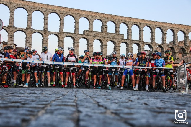 La salida tenía lugar a los pies del Acueducto de Segovia a las 8:00, aunque los que pasamos el arco de salida en las posiciones de atrás lo hicimos varios minutos más tarde debido al enorme embotellamiento que provocábamos tantas bicis. El gigantesco pelotón ya se empezó a estirar desde el primer momento, a pesar de ser salida neutralizada hasta La Granja, la gente se lo tomó en serio desde el primer minuto.
